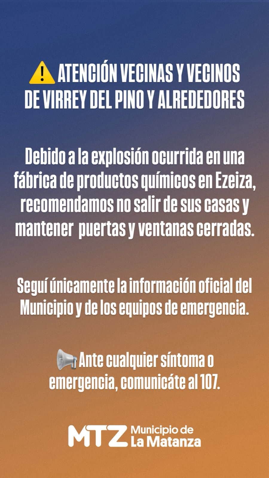 Debido a la explosión ocurrida en una fábrica de productos químicos en el distrito de Ezeiza, recomendamos no salir de sus casas y mantener las puertas y las ventanas cerradas.